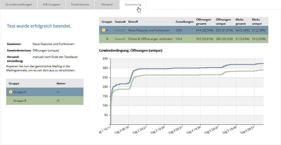 - Automatisch am Ende der Testdauer: Das Gewinnermailing wird automatisch ermittelt und versendet. Der Versandzeitpunkt wird angezeigt.