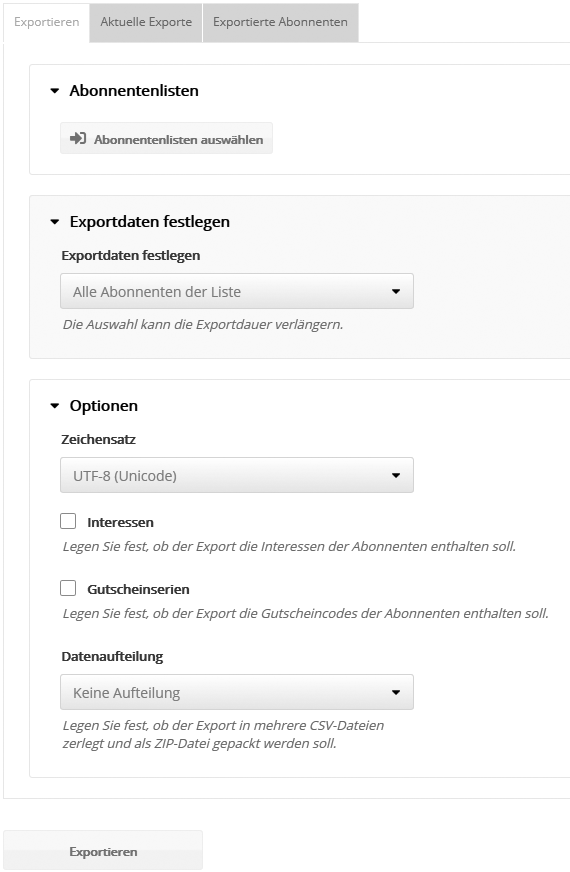 Abonnenten: ExportAbonnentenlisten lassen sich aus newsletterprofi.services als CSV-Dateien exportieren. Damit können Sie lokale Backups Ihrer Abonnentenlisten anlegen oder den Inhalt bearbeiten und anschließend per Import-Methode 'Aktualisieren' erneut importieren.
