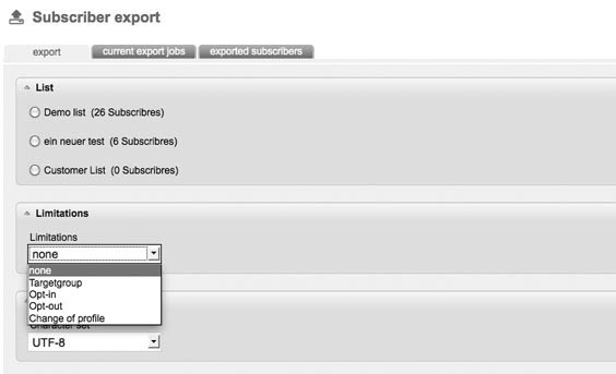 Subscribers lists can be exported from newsletterprofi.services as CSV – files. An advantage, for example, is that you can back up the address lists in this way. In the tab 'Export’, you can make choices of the lists that have to be exported. Per export only one subscriber list can be chosen. If you only want to export certain data records, you can decide on 'Limitations’. |