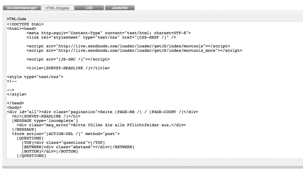 Insert your entire html source code. By creating a new template, newsletterprofi.services generates a sample html source code with all important survey-placeholders automatically in this tab.