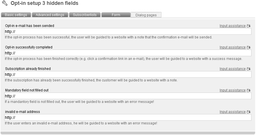 Now enter a name and an optional description for your optin setup. Then choose the 'mode' (important). The following modes are supported by 'newsletterprofi.services': Double Opt-in with confirmation e-mail (recommended as the only legally secure login variant): Interested party visits a website with an optin setup form. He enters his data into the form. He gots an e-mail with content like this: „Thank you for your optin. Please confirm the registration confirmation link to complete your registration.“ He clicks the link. Registration is completed. He gots a „welcoming“ e-mail. You can integrate information about your company and a certain design as well. Double Opt-in: Like described before, but without sending of a „welcoming“ e-mail. Confirmed Opt-In: Nach Anmeldung auf der Webseite wird sofort eine automatische Begrüßungsnachricht versendet. Single Opt-in: No e-mails will be send. There just will be a message in your browser, that registration was successfull. According to the mode you've choosed, you have to adapt different sub-options. In Tab 'advanced settings' you can deposit your e-mail address in field 'e-mail forwarding', to be informed about new subscribers. In field 'mailing for later delivery' you can determine your last sended newsletter. All new subscribers will receive your last mailing and don't have to wait for another one. To protect your optin-form against abuse, activate the invisible captcha . Captchas are often used to check if petitions are produced by a machine (robot, short: bot) or a real person. Bots are often used abusive to generate masses of subscriptions. Choose your favorite subscriberfields, which should be filled in in next tab 'Form'. After clicking 'Add subscriberfield' a pop up appears, where you can select and add subscriberfields to your optin-form. Furthermore you can add one or more subscriberlists as option(s) in a ceckbox through the button 'add subscriberlist'. Click 'sort formfields' to edit order of your fields. Click 'test form' to check your form by a preview of your optin-form. Next tab: 'Dialog pages':