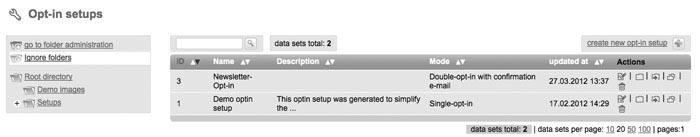 Through 'Setups' and 'Optin Setup' you can create forms, which can be included into your website. So interested parties can login automatically on your website for your subscriberlist(s). Please note: Requirement for a successfull 'optin setup' is to create an e-mail with type 'dialog mailing' for registration confirmation and welcoming, which got the status 'activated'. Otherwise those mailings will be lacking in the shortlist of mailings which you can choose for your optin setup. For an esier start newsletterprofi.services gots a „Demo optin setup“ for you. Created optin setups can be 'opend' afterwards for editing, 'moving' to another folder or 'deleting'. If you have moved an optin setup into another folder, click 'open folder' to get into. Create new Optin setup |
