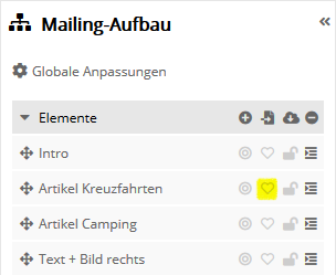 Rechts und links neben dem Mailing-Entwurf lassen sich 3 Panels aufklappen. Das Panel 'Mailing-Aufbau' können Sie wahlweise auf der linken oder rechten Bildschirmseite platzieren, umschaltbar über das 2. Symbol oben in der Werkzeugleiste. Mailing-AufbauHier wird der aktuelle Aufbau Ihres Mailings als Elementbaum dargestellt. Diese Ansicht ist besonders für die Arbeit mit komplexeren Mailings hilfreich. In der obersten Ebene des Elementbaums werden Container (dunkle Hintergrundfarbe) angezeigt. Diese geben dabei das Grundgerüst des Mailings vor. Die Reihenfolge von Containern kann nicht verändert werden. Jeder Container kann sowohl Elemente (helle Hintergrundfarbe), als auch weitere Unter-Container enthalten. Die Elemente sind dabei die sichtbaren Bestandteile des Mailings wie Artikel, Bilder und Texte. Die Reihenfolge von Elementen können Sie per Drag&Drop Ihren Wünschen gemäß anpassen. Welche Container und Elemente in einem Mailing zur Verfügung stehen, wird dabei durch das gewählte Mailing-Template festgelegt.