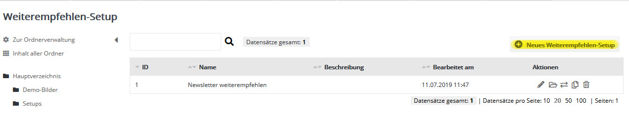 Bereits erstellte Weiterempfehlen-Setups lassen sich nachträglich bearbeiten ('öffnen'), in Unterordner 'verschieben' und 'löschen'. Sollten Sie eine Verschiebung in Unterordner bereits vorgenommen haben, lässt sich über die Schaltfläche 'Ordner öffnen' in den beinhaltenden Unterordner wechseln.