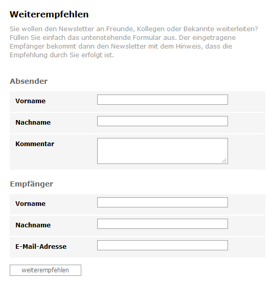 Mithilfe des 'Weiterempfehlen'-Moduls erstellen Sie Formulare, durch die Empfänger Ihren Newsletter an Freunde, Kollegen, Bekannte, etc. weiterempfehlen können. Ein Beispiel, wie sich der Ablauf gestalten könnte: Abonnent klickt im Newsletter auf 'Newsletter weiterempfehlen' ‚ 'Eintragung aller nötiger Daten in ein Formular', Meldung 'Die E-Mail wurde weitergeleitet' und 'Empfänger erhält die Weiterleitung'.