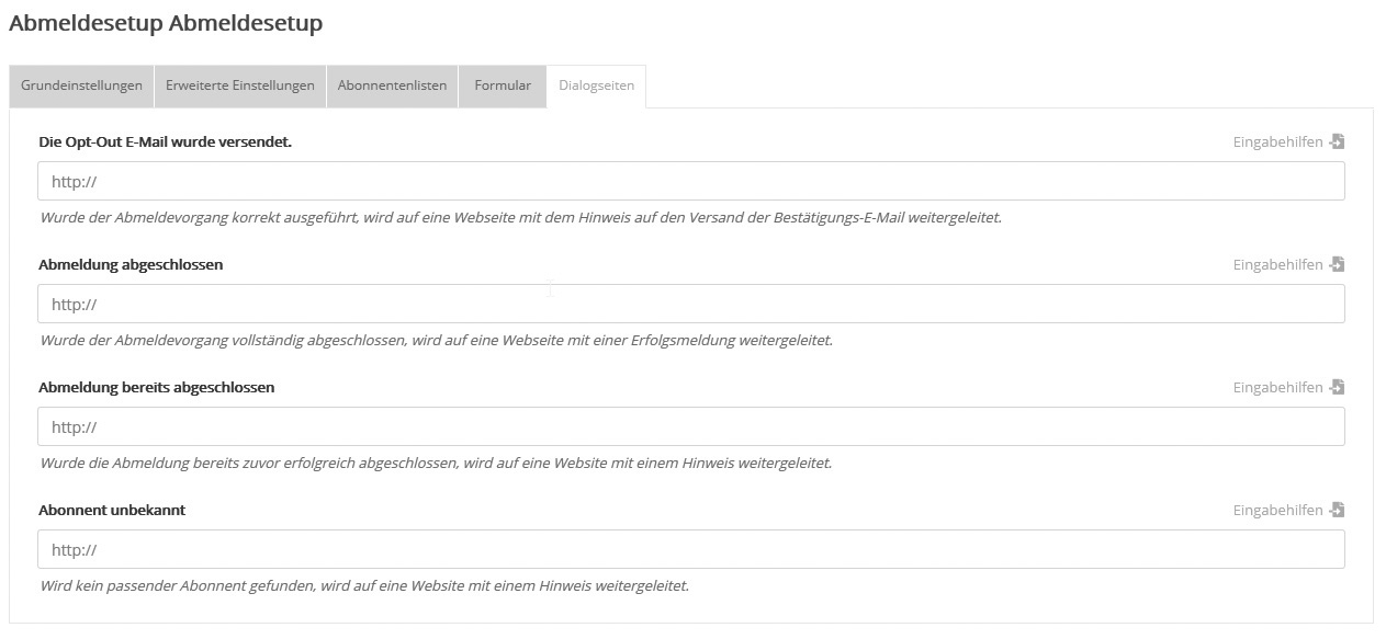 AbonnentenlistenJe nachdem, ob die Abmeldung per Newsletter-Link oder per Website-Formular stattfindet, wird der Abonnent aus folgenden Listen abgemeldet: Variante 1: Abmeldelink im NewsletterFür Standardmails gilt: Zusätzlich zu den auf dem Reiter 'Abonnentenlisten' gewählten Listen findet die Abmeldung auch in den angeschriebenen Listen statt. Für Kampagnen- und Dialogmails gilt dieser Zusatz nicht, da diese nicht an eine bestimmte Liste verschickt werden. Variante 2: Abmeldeformular auf WebsiteDie Abmeldung findet in den unter 'Abonnentenlisten' markierten Listen statt, und wenn vorhanden, dann auch in den direkt im Formular zur Auswahl durch den Nutzer angebotenen Listen (siehe nächster Abschnitt 'Formular'). Beides gleichzeitig ist nicht möglich. Das heißt: Sobald Sie eine Liste im Reiter 'Abonnentenlisten' markiert haben (und damit fest vorgeben), kann sie nicht gleichzeitig im Abmelde-Formular (ab)wählbar sein. Im dem Fall wird sie automatisch aus dem Formular entfernt und umgekehrt. Sonderfall beim Abmeldeformular: Ist keine Liste zur Abmeldung markiert und auch im Formular keine enthalten, dann findet die Abmeldung in allen Listen statt. Damit wird der Abonnent auch aus der 'Abonnentenverwaltung' entfernt. FormularHier erstellt newsletterprofi.services automatisch den Quellcode für ein Abmeldeformular, das Sie auf Ihrer Website einbinden können. Den Inhalt des Formulars stellen Sie per Drag&Drop zusammen. Die Bedienung ist identisch zum Anmeldeformular-Editor. Nach Klick auf den Button 'Test des Formulars' wird Ihr neues Abmeldeformular angezeigt und die Funktion lässt sich anhand realer Abmeldungen testen. Geben Sie gültige und ungültige Abonnentendaten ein, um die entsprechenden Textmeldungen bzw. Dialogseiten zu prüfen. Ein während des Tests abgemeldeter Abonnent lässt sich unter 'Abonnenten' -> 'Abmeldungen' wiederherstellen. --> Hinweis zu Abmeldungen beim Testversand: Solange es sich um den Testversand eines Mailings handelt, findet bei Klick auf den Abmeldelink keine Abmeldung statt. Stattdessen wird lediglich eine Bestätigung angezeigt, ob das Abmeldesetup korrekt eingerichtet wurde. Erst beim späteren realen Versand findet eine tatsächliche Abmeldung statt und es erscheint die von Ihnen eingestellte Dialogseite, die Sie unter 'Formular testen' jederzeit testen können. Dialogseiten |